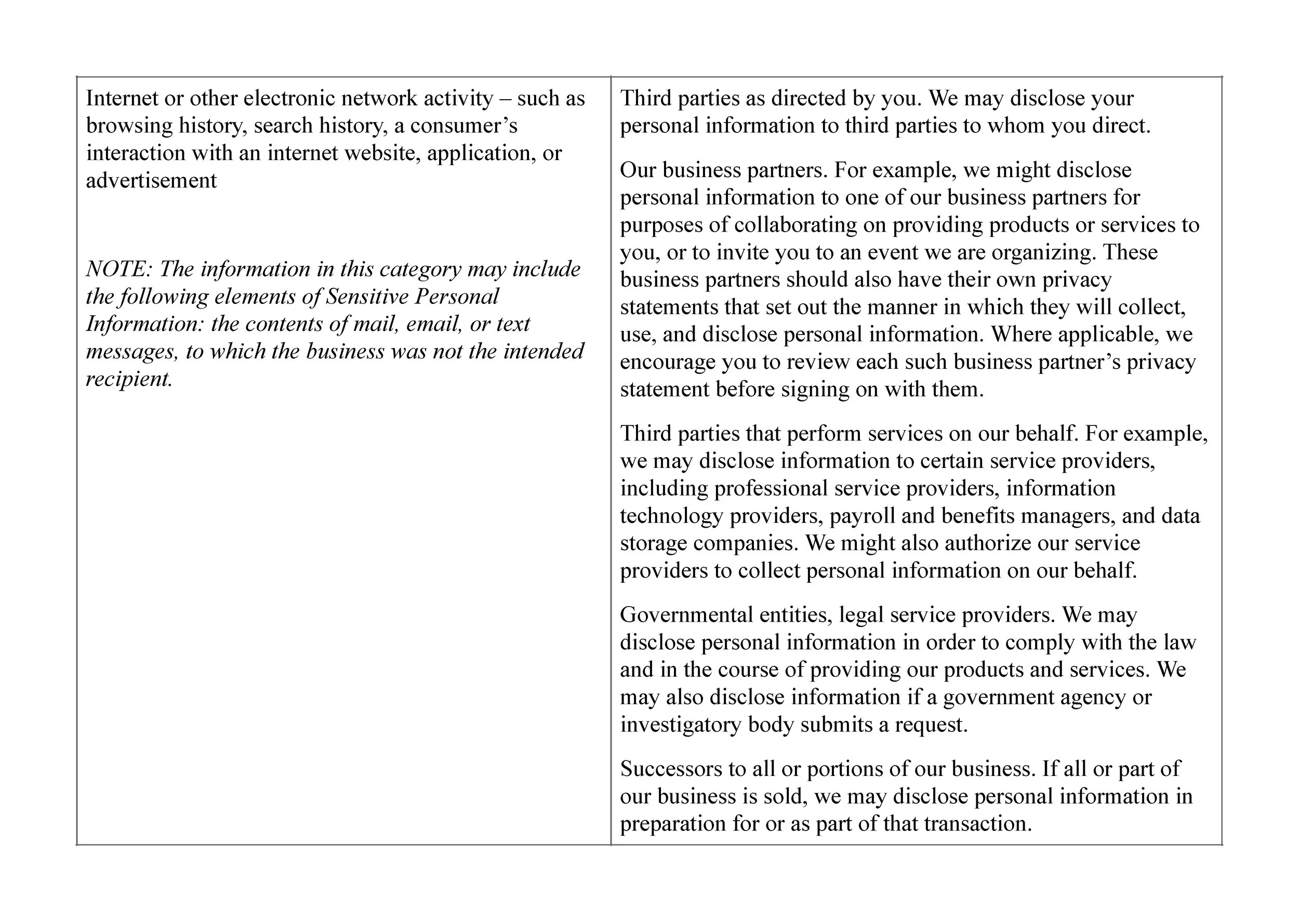 Please note that when we function as a service provider or contractor to our business clients, and have received your personal information in connection with those functions, we are not obligated to respond to your requests concerning personal information. In those cases, we may direct you to the applicable business client(s) with whom you have a direct relationship.